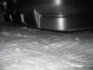 写真のシーンは歩道から車道に下りかけてでも車道には雪が沢山ある状況で、私のとこでは一番高さがきつくなってるとこを写真で撮ってみました。バンパーの底部と道路(雪)までの差は4〜5cm有るか無いかといったところです(これでもかなり車道にまで渡って道路の氷を削った後の状況です)。