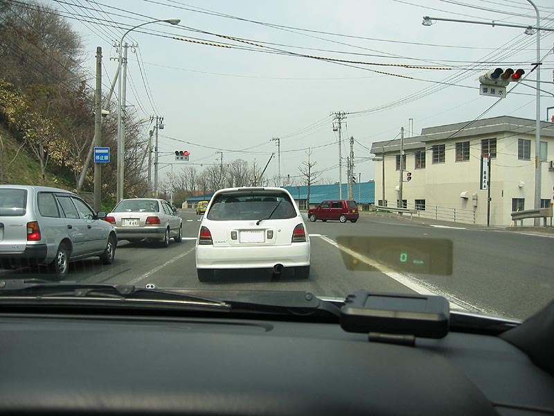 途中、やたらと警察が居たのはGWだからしょうがないかな、と言った感じですが、無事捕まりもせず、朝里のスーパーで肉などの食材を買い込み、朝里ダムへ。この写真は朝里ダムに行く途中の信号待ちで前に止まっているA君のスターレット