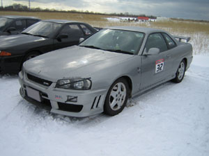 私はクラス2だったので、まずはクラス0の人(お〜みやさん、ネプさん)の走りを見てみたくて観戦していたところ、他の方(ECR33の方だったかな?)が雪山に突っ込んでバンパー破損されてました。気温が高い影響もあるのでしょうが、雪が思ったよりも堅くなってて結構場所によってはバンパー破損など痛い出費になりそうな箇所があったので、そこだけまずは頭にインプットして、いざ一本目の走行。