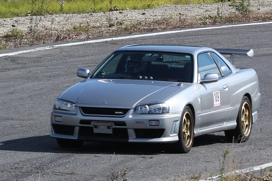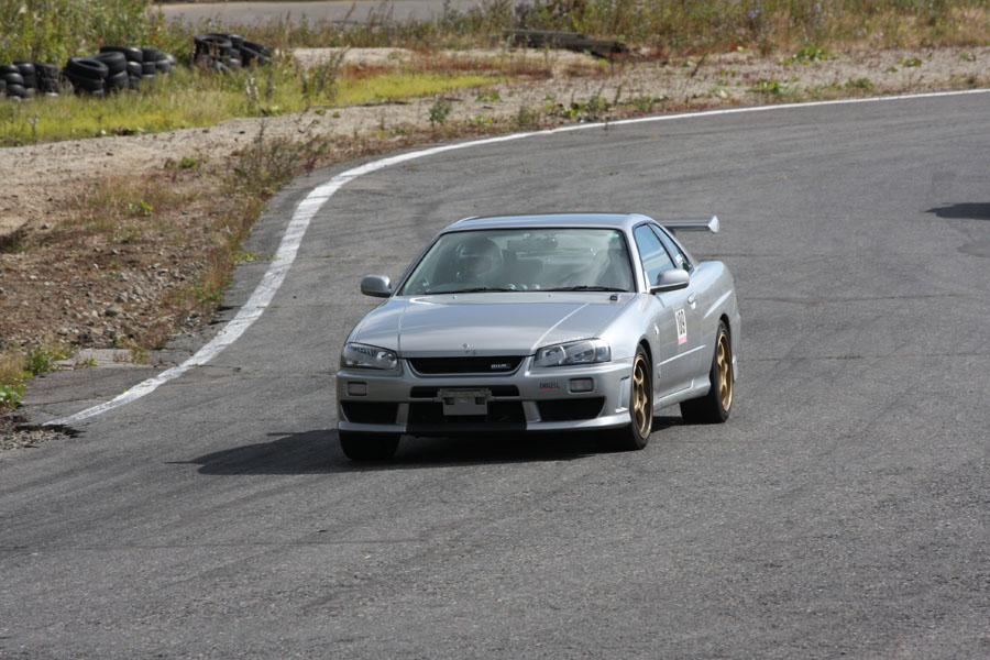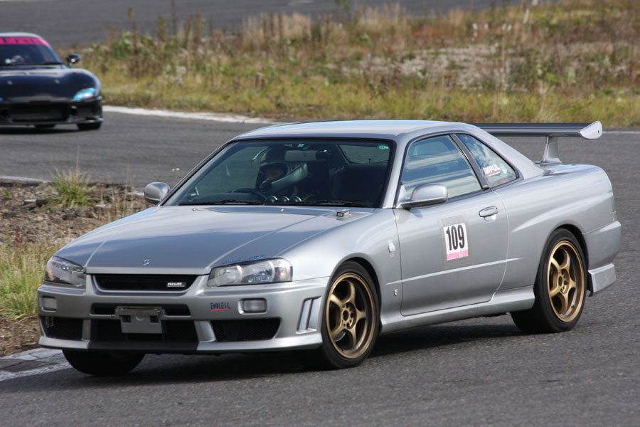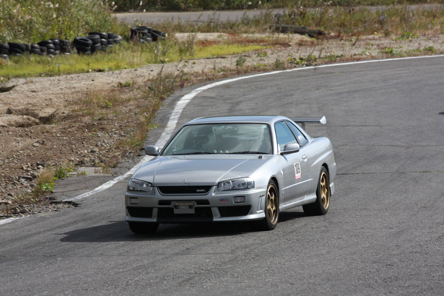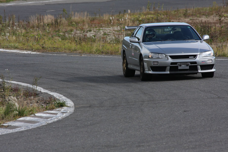 久々に(1年ぶりに)走行会に出てみました。前回はロールが酷くて苦しんだので、フロント12Kg/リア12Kgのバネになったり、リアウイングがBNR34純正+NIGHT PAGER リヤウイングスペーサー(R34 GT-R専用)5cmタイプを装着したりと、色々と仕様変更が有った物の、多忙のため走りには行けなかったので、久々の走行会でした。車高調のセッティングというか減衰力は、気温が低かったこともあり街乗りと同様の状態(前後とも8段中の5段目(真ん中よりちょっと固め))。空気圧は180kPa〜190kPaくらいです。