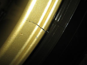 2005年11月19日にもうとうとう雪が積もって(出かける用事もあるため)観念してとりあえず今日は冬タイヤにして、あとは晴れた日で暖かい日があったら現地(白老)で夏タイヤに履き替えて走って、帰りはまた冬タイヤで・・・とかで走り納めをしようか、と思って冬タイヤを装着していったのですが、一通り全部交換し終わって夏タイヤを洗い始めたところ、右前に履いていたアルミが「割れている」事に気がつきました。。。