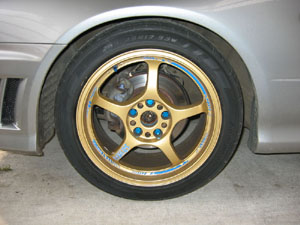 兆候としては、今年(2005年)のいつだったか忘れましたが多分春先にタイヤのバランスを取った際に(どうもハンドルに振動が伝わってくるのが気になっていたので)、今回壊れたアルミが若干歪んでいることは指摘を受けていました(まだ重りでなんとかバランスの取りきれるギリギリくらいのとこだと言われました)。なので左回りで一番負担のかかる右(しかもENR34は前が重いので特に右前)に履くのは辞めるべきとは解っていたのですが、一旦リア(右後)にはいた後、今度はタイヤの摩耗具合の関係で、どうしても前に戻す必要があり、仕方なく前に履いていたので、まあしょうがないと言えばしょうがないです(有る程度覚悟しては居たので)。タイヤを全部組み替えて左後ろに持って行っていればもう少し寿命は延びたでしょうが、さすがにそこまでする気になれませんでした。