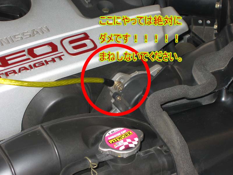 やってはダメと言うよりも、アーシングケーブルがつながっている先の「ネジ」を勝手にはずしちゃダメです(T_T)。ここはクランク回転角センサーだそうで、これのネジを一度でもはずしてしまうと、正確なクランク角が検出できずに正常な値が拾えなくなり、コンピュータが正確な回転数や点火時期の算出を行えなくなり、最悪点火不良が起こりエンジンの始動性やふけが悪くなるなどの影響が出ます。しかも直すにはディーラーに持っていかないといけません(それでも直すのには結構お金かかりそうですが・・・)。