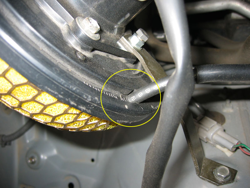 黄色の丸印で囲んだところが、ターボ車(ER34)用のHKS Super Power Flow DDをENR34に装着するために必要な加工(穴開け加工)になります(ターボ用はこのセンサーは無いので穴はあいてませんが、ENR34にはセンサー(チューブのような物)があるのでそれをエアクリの中に差し込むための穴を開けてやる必要があります)。差し込むのがセンサーなので(差し込む長さは2cmくらいです)、抜けにくいように開ける穴の大きさはセンサーの直径よりも小さめにして抜けにくくすると良いと思います。