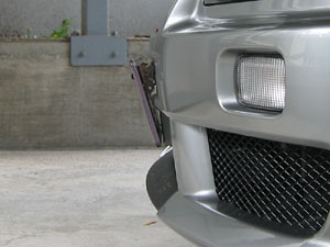 ナンバープレートステー装着後のナンバープレートを真横から撮った写真。 現実問題として、これ以上ナンバープレートを斜めにしようとしても、純正エアロの形状的にそれはムリなんですよね(^_^;。