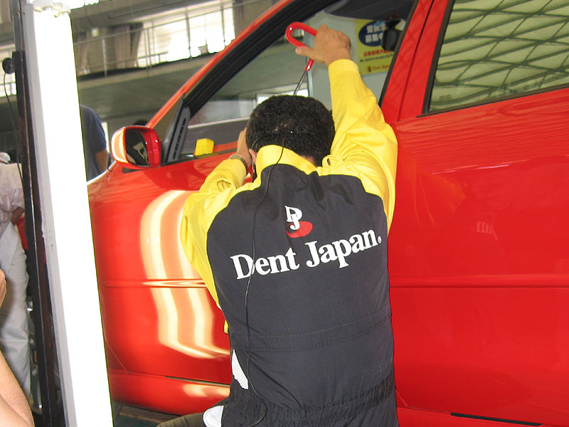 板金屋さん(?)なのですが、ドアパンチ(隣に駐車していた車がドア開けたときにこちらに当てられて出来たへこみ)とかを出張で直してくれる!というその技術を見せてくれる小さい展示スペースでしたが(料金は一カ所8000円とのこと)、おもむろにハンマーを取り出して、軽く叩くくらいかと思ったら結構ぼかん!とドアを叩いてまずはへこみを作ります。蛍光灯で照らすと明らかによくくらうくらいの(そして私の車にも有る・・・)へこみが出来上がります。