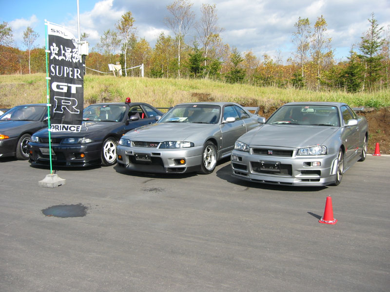 かっきさんの誘導を受け、向かって右からR34 GT-R(おーちゃんさん)、R33 GT-R(たなさん、R33ハヤシさん)、R32 GT-R(かっきーさん)、R34(けい、たかしさん、いっちゃんさん)、R33(ENR33さん、高田改さん)、R32(あもんさん、名雲マリさん、オーテックさん)。