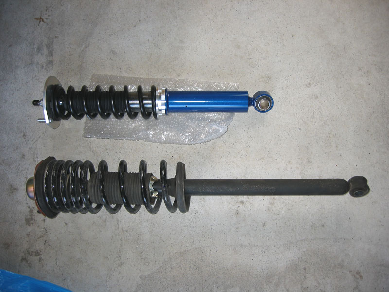 で、まずはリアから外したのですが、純正と、今回の車高調の長さの比較。